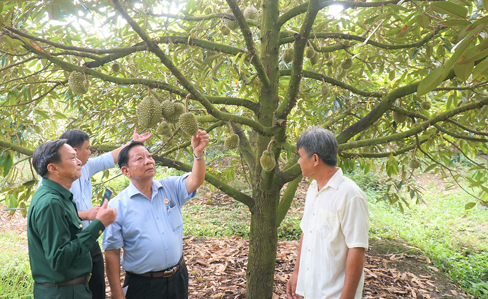 Lãnh đạo Hội CCB thành phố và các Hội CCB cơ sở tham quan mô hình trồng sầu riêng của hội viên CCB ở xã Phong Điền. Ảnh: PHẠM TRUNG