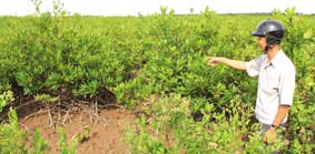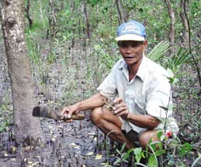 Nông dân Sáu Quý, tỉnh Trà Vinh giới thiệu nguồn lợi cua biển dưới tán rừng do ông trồng. Ảnh: T. HÀ |