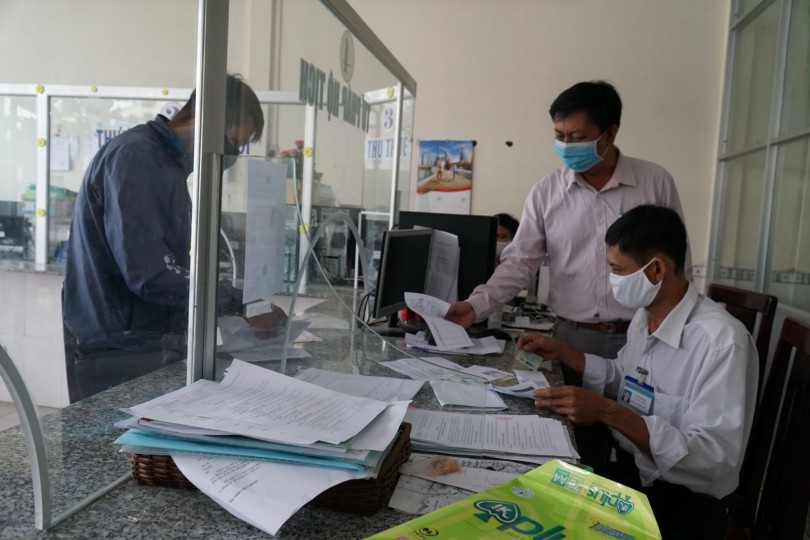 Thường trực Đảng ủy xã Trường Long kiểm tra công chức Bộ phận Một cửa giải quyết thủ tục hành chính của người dân.