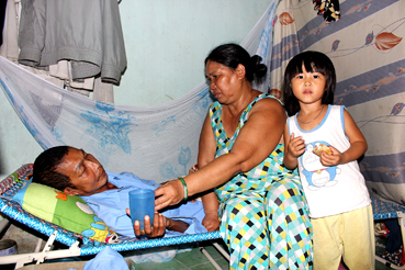 Trước đây chú Tiến làm thuê ở công ty cấp thoát nước, cuộc sống gia đình cũng tạm ổn. Hơn 1 năm trước, chú thường ho khan, sức khỏe suy yếu dần nhưng chú cố gắng lướt qua bệnh vì sợ tốn kém. Đến cuối năm 2015, chú ho ngày càng nhiều, rồi một lần, chú vật vã, ho ra máu, người thân vay mượn tiền hàng xóm, đưa chú Tiến đến bệnh viện. Các bác sĩ chẩn đoán, chú bị bệnh lao phổi giai đoạn nặng, kèm nhiều biến chứng, thiếu máu nhiều, phải nhập viện điều trị. Chú là trụ cột chính của gia đình, làm ngày nào ăn ngày đó, nên khi chú lâm bệnh, gia đình rơi vào cảnh túng thiếu, không cách nào xoay xở. Trong thời gian điều trị, vì không có tiền và thẻ bảo hiểm y tế, mặc dù bệnh lao phổi được nhà nước hỗ trợ điều trị miễn phí nhưng phải tốn kém các khoản chi phí khác nên chú đành xin xuất viện, về nhà, cắn răng chịu đựng bệnh tật giày vò đau đớn. Mấy tháng nay, bệnh chú ngày càng trở nặng, đi đứng khó khăn, di chuyển, tiểu tiện phải có người giúp đỡ. Mới ngoài 50 tuổi, vì căn bệnh hoành hành, lại không được bồi bổ thức ăn, chú Tiến gầy nhom, da sạm đen, hơi thở yếu ớt, giọng nói thều thào. Từ khi chú Tiến phát bệnh, vợ chú phải túc trực chăm sóc, chẳng làm được việc gì. Cảm thông hoàn cảnh cô chú, hàng xóm mướn cô Mùa giúp việc nhà, tiền công mỗi buổi 20 - 30 ngàn đồng.