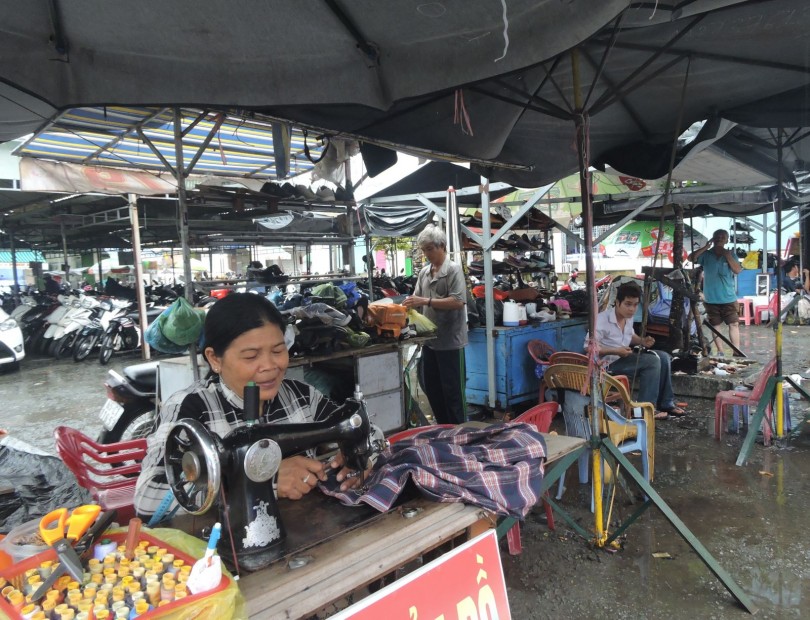 Dọc theo 2 con đường Hồ Tùng Mậu và Nguyễn Đức Cảnh (quận Ninh Kiều), cạnh các nhà lồng chợ chuyên mua bán bách hóa và may mặc, giày dép, vải vóc của Trung tâm Thương mại Cái Khế có khá nhiều anh, chị, cô chú làm nghề sửa chữa quần áo, giày dép. Chỉ với chiếc bàn máy may hay tủ đồ nghề nhỏ gọn là đã đủ để những người thợ miệt mài mưu sinh, làm hài lòng khách hàng đến với trung tâm mua sắm quy mô nhất nhì của thành phố.