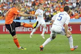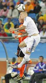 Gặp Slovakia - đội bóng từng loại Italia, Hà Lan nhập cuộc rất thận trọng bằng lối đá chậm, chặt chẽ mọi tuyến vào tối 28-6 trên sân Moses Mabhida. Trước hàng thủ dày đặc của đối phương, đội bóng xứ sở hoa Tuy-líp chọn giải pháp sút xa hoặc chuyền vượt tuyến cho tiền đạo Van Persie đánh đầu. Phút 11, tiền vệ Sneijder của Hà Lan không thắng được thủ môn Mucha trong tình huống đối mặt. Hà Lan chỉ vươn lên dẫn trước 1-0 nhờ một pha bóng tỏa sáng của tiền vệ Robben. Phút 18, Robben tăng tốc bên cánh phải nhận đường chuyền dài của đồng đội rồi ngoặt vào trung lộ, tung cú sút chân trái bóng bay sát cột dọc khung thành. Có bàn thắng, Hà Lan vẫn chơi chậm, rình rập chờ đối phương sơ hở. Điều này tạo điều kiện cho Slovakia lên bóng tấn công, nhưng không tạo được cơ hội nguy hiểm nào trước hàng thủ chắc chắn của Hà Lan.