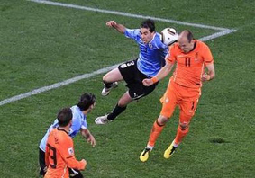 Trong trận bán kết 1 vào rạng sáng 7-7, trên sân Green Point, dù bị đánh giá thấp hơn Hà Lan, nhưng Uruguay đã gây bất ngờ khi nhập cuộc bằng lối chơi tấn công nhanh với những pha chuyền dài cho cặp tiền đạo Cavani và Forlan bứt phá. Hà Lan chơi chắc chắn với số đông ở tuyến tiền vệ, chỉ cắm mỗi Robin van Persie ở tuyến đầu. Đội bóng châu Au tạo ra cơ hội nguy hiểm đầu tiên khi Dirk Kuyt chớp cơ hội dứt điểm vọt xà ngang thủ môn Muslera ở phút thứ 3. Kế đó, Sneijder sút xa rất căng nhưng bóng lại trúng người đồng đội Persie dội ra ngoài. Hà Lan khá bế tắc bởi lối chơi biên tạt bóng vào phía trong cho các mũi nhọn đánh đầu không gây khó khăn cho hàng thủ Uruguay tỉnh táo, bọc lót tốt.