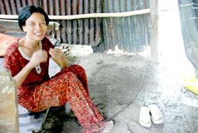 Chị Nguyễn Khoai Mỳ đang bị xích lại trong căn chòi. |