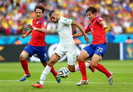 Tiền đạo Slimani (giữa) đột phá qua cặp trung vệ Kim Young-Gwon (trái) và Hong Jeong-Ho, ghi bàn tạo bước ngoặt trận đấu. Ảnh: FIFA.
