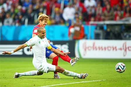 Son Heung-Min (áo đỏ) vượt qua sự truy cản của Mddjid Bougherra ghi bàn thắng rút ngắn tỷ số cho Hàn Quốc. Ảnh: FIFA.