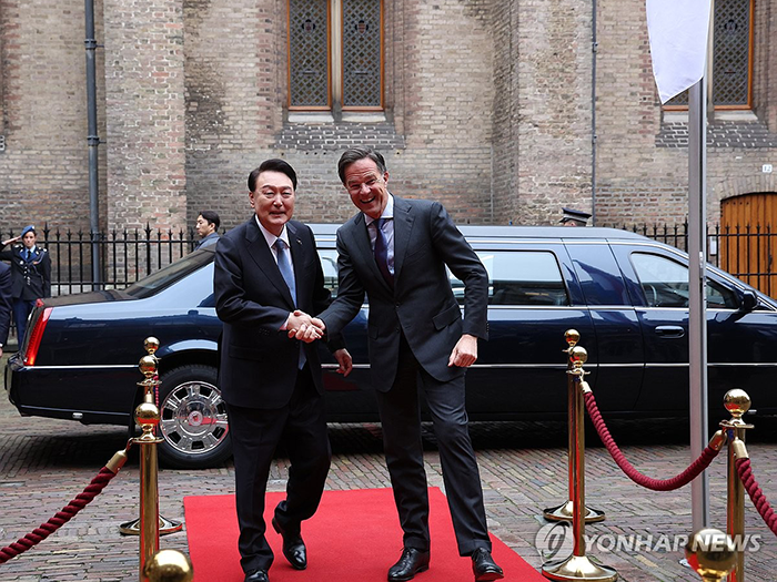 Tổng thống Hàn Quốc Yoon Suk-yeol (trái) được Thủ tướng Hà Lan Mark Rutte chào đón tại văn phòng ở The Hague.