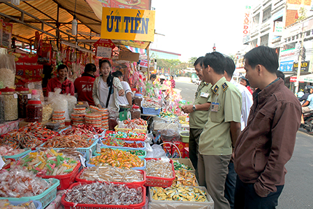 Đoàn kiểm tra công tác bình ổn giá do Sở Công thương TP Cần Thơ chủ trì đang kiểm tra tình hình mua bán bánh kẹo tại điểm chợ Tết ở đường Nguyễn An Ninh, quận Ninh Kiều, TP Cần Thơ.