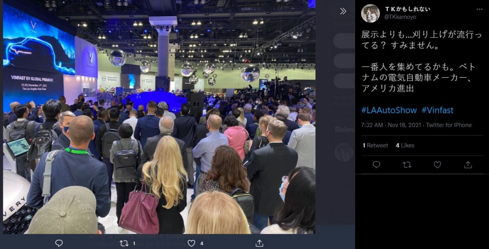 Một tài khoản từ người dùng Nhật Bản chia sẻ về khoảnh khắc đáng nhớ tại LA Auto Show khi phía xa là những chiếc xe điện VinFast chuẩn bị được vén màn. “Có lẽ tôi đang ở nơi tập trung đông người nhất triển lãm”, người này viết trên trang cá nhân với hình ảnh hàng trăm người vây quanh 2 mẫu xe điện của Việt Nam. “Hơn cả một cuộc triển lãm”, khán giả người Nhật tiếp lời.