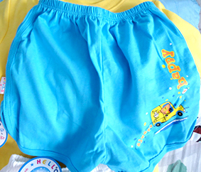 * Quần thun bé trai làm từ 100% cotton, mềm và thoáng mát, có nhiều gam màu, như: trắng, xanh, đỏ…; giá tham khảo: 32.000 đồng/cái.
