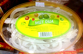 * Mứt dừa làm từ 60% dừa, đường, hương vani…; giá tham khảo: 47.000 đồng/hộp 200gram.