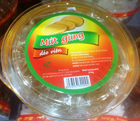 * Mứt gừng làm từ gừng củ, đu đủ, đường, muối… dùng ăn liền; giá tham khảo: 38.000 đồng/hộp 270gram.
