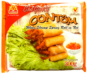*Chả giò rế con tôm làm từ thịt heo xay, tôm lột vỏ cắt hạt lựuvà các gia vị. Sản phẩm được sơ chế sẵn, tiện dụng giúp tiết kiệm thời gian nấu nướng. Sản phẩm của Công ty TNHH MTV Việt Nam Kỹ Nghệ Súc Sản; giá tham khảo: 40.800 đồng/gói 300gram.