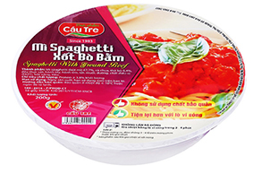 *Mì spaghetti sốt bò bằm thành phần, gồm: mì spaghetti, cà chua, thịt bò, dầu thực vật và các gia vị. Sản phẩm đóng gói dạng hộp tiện lợi; hương vị thơm ngon. Sản phẩm của Công ty cổ phần Chế biến Hàng xuất khẩu Cầu Tre; giá tham khảo: 26.900 đồng/hộp.