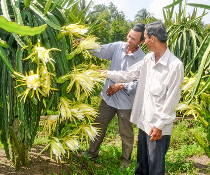 Chuyển đổi từ đất trồng lúa kém hiệu quả sang trồng thanh long đem lại thu nhập cao cho nhiều nông dân ở xã Đức Mỹ, huyện Càng Long, tỉnh Trà Vinh. Ảnh: T. LONG |