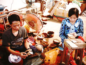 Thanh Hải và Kim Ngân đang gia công sản phẩm thủ công mỹ nghệ bằng gáo dừa, tại cơ sở Nhịp Cầu. |