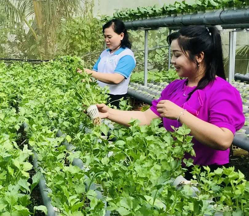 Chị Bích Vân (bìa phải) bên vườn rau đạt chuẩn VietGAP.