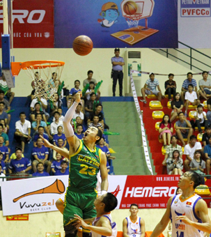Định Tâm (số 23) với cú ném bóng ghi 2 điểm cho Cần Thơ Catfish. Ảnh: NGUYỄN MINH |
