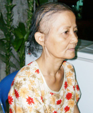 Chị Huỳnh Tuyết Mai năm nay 56 tuổi, nước da sạm đen, thân hình gầy gò và khi chị lột tóc giả xuống để lộ mái tóc thật chỉ còn le ngoe mấy sợi. Chị Mai cho biết đó là hậu quả của sự tàn phá cơ thể của căn bệnh ung thư và những đợt vô hóa chất điều trị.