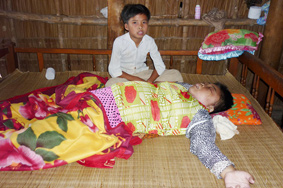 Anh Ngọt cho biết: “Mấy tháng qua, gia đình tôi sống nhờ vào tình thương của bà con chòm xóm và sự giúp đỡ của thầy Hoàng (sư Thích Nguyên Ngọc, trụ trì chùa Long Hòa ở thị trấn Trà Cú). Thầy cũng đã giúp tôi đưa vợ đi bệnh viện tỉnh 2 lần, thầy cho tiền mua thuốc và các chi phí khác. Tình cảnh của vợ tôi hiện giờ thật tình tôi cũng không biết tính sao, vì mỗi khi đỡ tay, hay chân lên là vợ tôi kêu khóc than đau. Nhưng ngặt nỗi tôi không có tiền để đưa vợ tôi đi bệnh viện điều trị”.