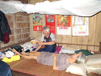 Sau khi bị tai biến, bà Tư không còn đi lại được nữa, hằng ngày ông Giàu xoa bóp thường xuyên để bà giảm đau nhức. |