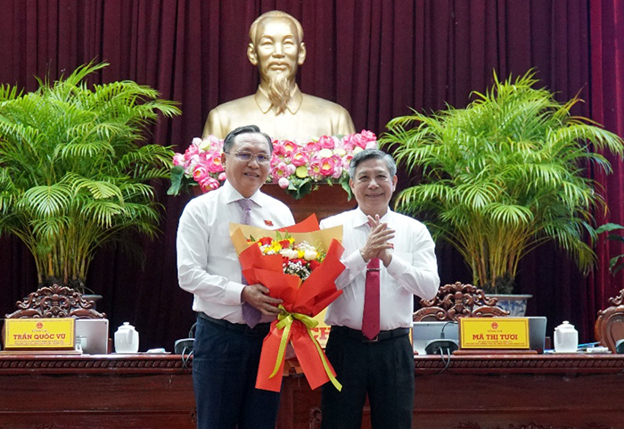 Ông Đồng Văn Thanh, Ủy viên Ban Chấp hành Trung ương Đảng, Phó Bí thư Thường trực Thành ủy, Chủ tịch HĐND thành phố, tặng hoa chúc mừng tân Phó Chủ tịch UBND thành phố Lê Công Lý.