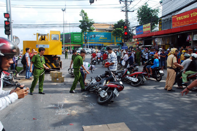 Hiện trường vụ TNGT xảy ra tại giao lộ Nguyễn Văn Linh- 30 Tháng 4: xe cẩu đụng 10 mô tô đậu trên làn ô tô chờ đèn đỏ. Ảnh: X.ĐÀO |