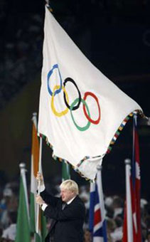 Thị trưởng thành phố Luân Đôn Boris Johnson nhận cờ đăng cai Olympic 2012. |