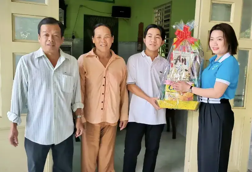 Chị Nguyễn Thị Ngọc Diễm (bên phải) thăm, tặng quà gia đình hội viên phụ nữ hoàn cảnh khó khăn, có con em nhập ngũ năm 2024. Ảnh: CTV