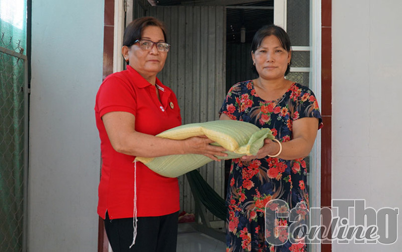 Khi chúng tôi đến trụ sở xã Thới Thạnh, chị Hận đã đến trao gạo và nhu yếu phẩm cho chị Đỗ Thị Hương ở ấp Thới Bình B. Chị Hương có hoàn cảnh đặc biệt khó khăn, chồng vừa bị tai nạn giao thông qua đời đầu tháng 5. Hằng ngày, chị rửa chén thuê kiếm 20.000-30.000 đồng để trang trải cuộc sống, nuôi con nhỏ. Chị Hận chia sẻ: “Thấy chị Hương khó khăn, chúng tôi đưa chị Hương vào địa chỉ nhân đạo để hỗ trợ mỗi tháng 10kg gạo và nhu yếu phẩm, góp phần giúp chị vượt qua khó khăn”. Ngoài gia đình chị Hương, còn có 4 gia đình khác vừa được khảo sát, lập danh sách đưa vào địa chỉ nhân đạo để được Hội CTĐ xã hỗ trợ hằng tháng mỗi hộ 10kg gạo và nhu yếu phẩm, trị giá từ 200.000-250.000 đồng.