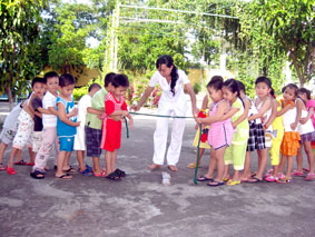 Con đường dẫn vào Trường Mầm non (MN) Trường Long, huyện Phong Điền rợp bóng mát. Trong khuôn viên trường có nhiều cây xanh, và các cụm hoa rực rỡ khoe sắc... Cùng các bạn tham gia sinh hoạt ngoài trời, bé Tuyết Anh (lớp Lá) bày tỏ: “Con rất thích sinh hoạt ngoài trời, vì vừa vui, vừa mát. Con có thể tưới cây, nhổ cỏ...”. Theo cô Lại Thị Ngọc Hóa, giáo viên phụ trách lớp, ngoài giờ học trên lớp, các cháu còn có giờ hoạt động ngoài trời nên việc “tô điểm” cho khuôn viên trường rất quan trọng, giúp các bé vừa chơi, vừa học để phát triển toàn diện.