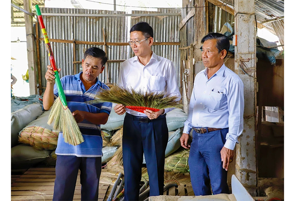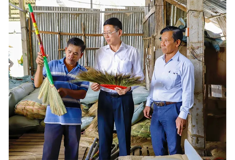 Ông Tiêu Minh Dưỡng, Phó Giám đốc Sở Nội vụ TP Cần Thơ (người thứ 2, bên phải qua) trực tiếp xem sản phẩm và trao đổi với Hợp tác xã Chổi bông cỏ Ngọc Tuyền Kinh Cùng về hiệu quả sử dụng vốn vay chính sách.