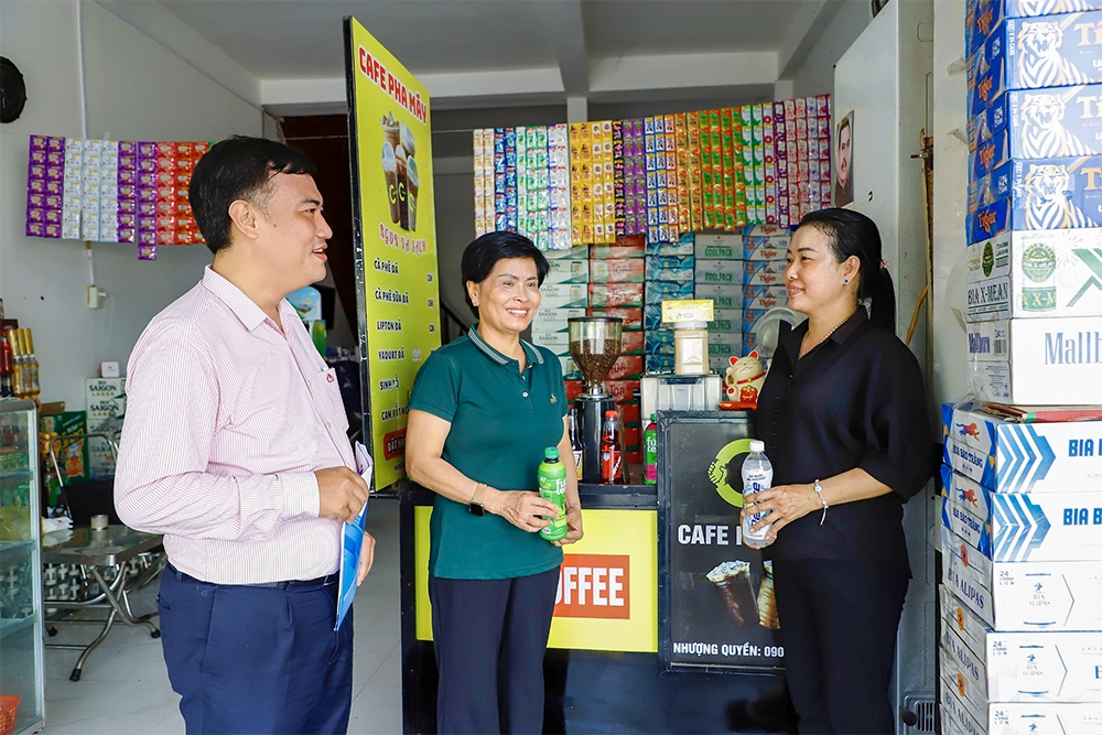 Cán bộ Phòng Giao dịch NHCSXH Bình Thủy thăm hỏi, kiểm tra tình hình sử dụng vốn vay tại cơ sở kinh doanh của chị Nguyễn Thị Phương Trang (bìa phải).