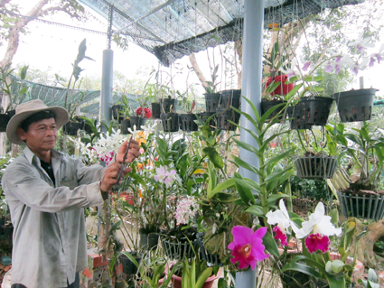 Ông Nguyễn Văn Tùng chăm sóc vườn lan. |
