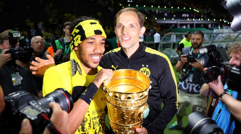 HLV Tuchel (phải) và Aubameyang thời còn phục vụ ở Borussia Dortmund. Ảnh: Reuters