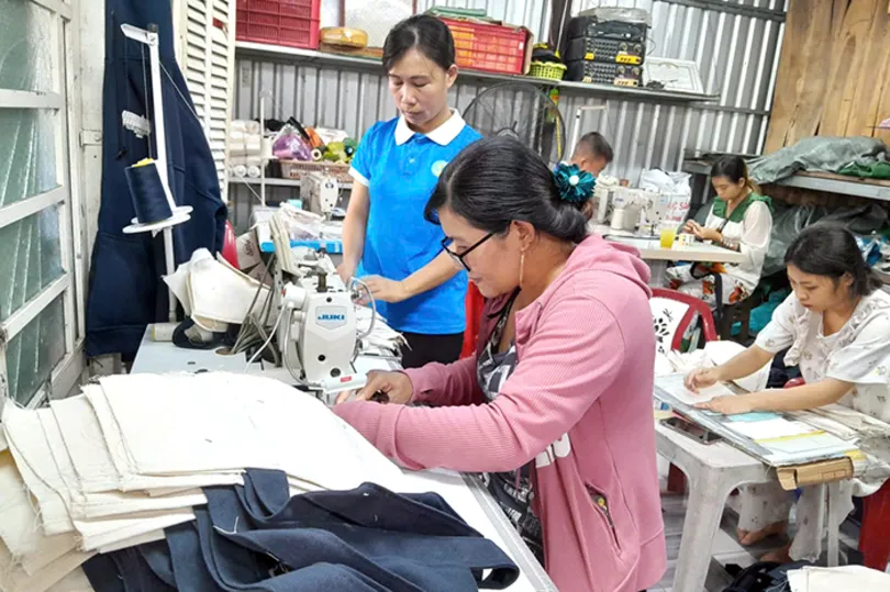 Cán bộ Hội LHPN xã Thạnh Quới thăm hỏi tình hình sản xuất của các thành viên Tổ liên kết may túi xách tại ấp Phụng Phụng. Ảnh: Đơn vị cung cấp