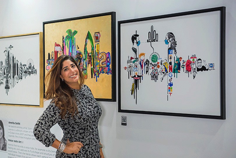 Tác phẩm đầu tiên Amrita Sethi thực hiện năm 2019 tại Dubai - nơi cô đang sống. Nhìn vào đường sóng âm, cô phác họa lại và thể hiện hình ảnh các tòa nhà chọc trời, các địa danh, cảnh quan đặc trưng của thành phố Dubai lên tranh. Những bức tranh của Amrita Sethi đều mang màu sắc riêng bởi ẩn chứa cảm xúc thông qua ngôn từ và các sóng âm. Amrita Sethi nói: “Tôi muốn nắm bắt cảm xúc và ý thức con người thông qua các từ, cụm từ họ nói rồi trình bày một cách trừu tượng lên tranh”. Amrita Sethi chú trọng cảm xúc trong các bức vẽ nên tranh của cô sống động và có sức thu hút. Ðiều đó thể hiện rõ qua việc Amrita Sethi gắn thêm mã QR lên các tác phẩm, giúp người xem vừa có thể thưởng lãm tranh vừa nghe thêm tệp âm thanh của lời nói.