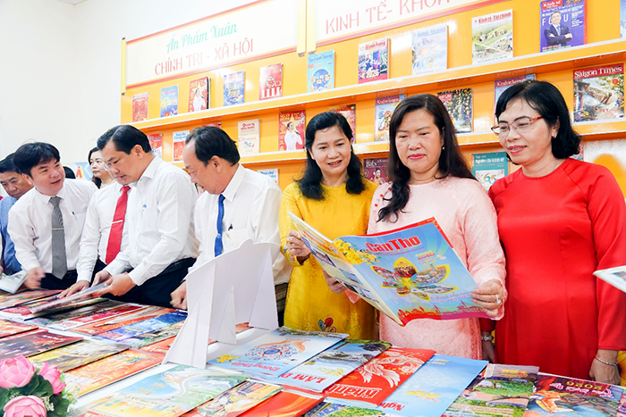 Dịp này, TP Cần Thơ tổ chức tổng kết Hội Báo xuân và Cuộc thi Ấn phẩm xuân Bính Ngọ 2026. Trong ảnh: Lãnh đạo thành phố và các đại biểu xem ấn phẩm trưng bày tại Hội Báo xuân.