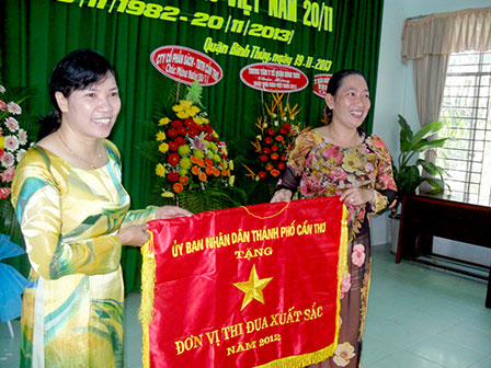 Đại diện Trường Mầm non Phong Lan (bên trái) nhận Cờ thi đua xuất sắc của UBND TP Cần Thơ vì đạt thành tích tốt trong năm học 2012 - 2013. Ảnh: THU SƯƠNG