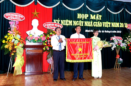 Thầy Trần Thanh Tài , Trưởng phòng Giáo dục Tiểu học Sở Giáo dục và Đào tạo thành phố trao Cờ thi đua của Bộ Giáo dục và Đào tạo cho đại diện Trường Tiểu học Lê Quý Đôn, vì đã có thành tích tiêu biểu xuất sắc thực hiện nhiệm vụ năm học 2012 - 2013. Ảnh: T.HẰNG