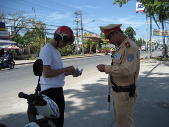 Cảnh sát giao thông quận Bình Thủy kiểm tra giấy tờ xe của người tham gia giao thông. |