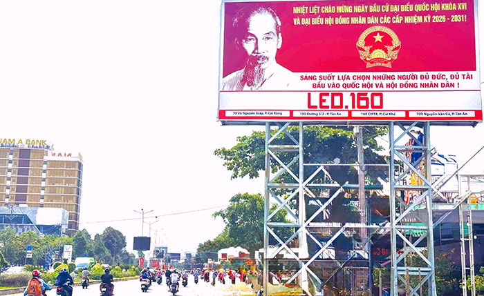 TP Cần Thơ treo nhiều pano, áp phích tuyên truyền về bầu cử tại các tuyến đường chính và chỉnh trang đô thị. Trong ảnh: Pano kích thước lớn được dựng trên đường Võ Nguyên Giáp, phường Hưng Phú.