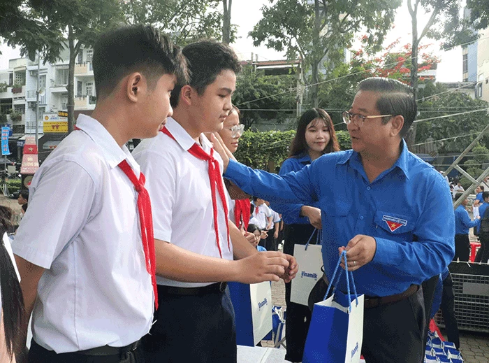 Đồng chí Trần Việt Trường, Phó Bí thư Thành ủy, Chủ tịch UBND TP Cần Thơ và đồng chí Nguyễn Ngọc Tâm, Ủy viên Ban Thường vụ, Trưởng Ban Tuyên giáo Thành ủy, tặng quà và học bổng cho học sinh vượt khó học tốt.