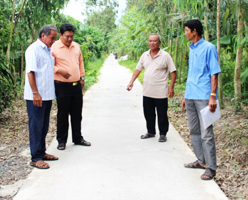 Cán bộ Khối Dân vận và bà con ấp 8 trao đổi về chất lượng công trình giao thông kênh B9, bờ trái. |