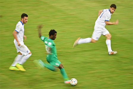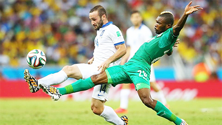 Dimitrios Salpingidis (áo trắng) của Hy Lạp vượt qua sự truy cản của Die Serey.