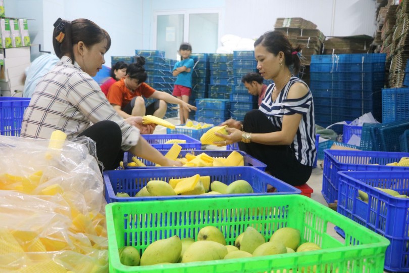 Công nhân phân loại xoài tại Công ty TNHH Kim Nhung. Ảnh: VÂN KHÁNH