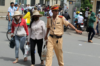 CSGT Công an TP Cần Thơ dẫn phụ huynh và thí sinh qua lộ trên đường 3 Tháng 2, sau khi kết thúc đợt 2 kỳ thi ĐH. Ảnh: X. ĐÀO |