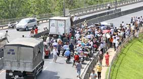 Kẹt xe kéo dài trên cầu Mỹ Thuận do xe tải chở bò bị lật