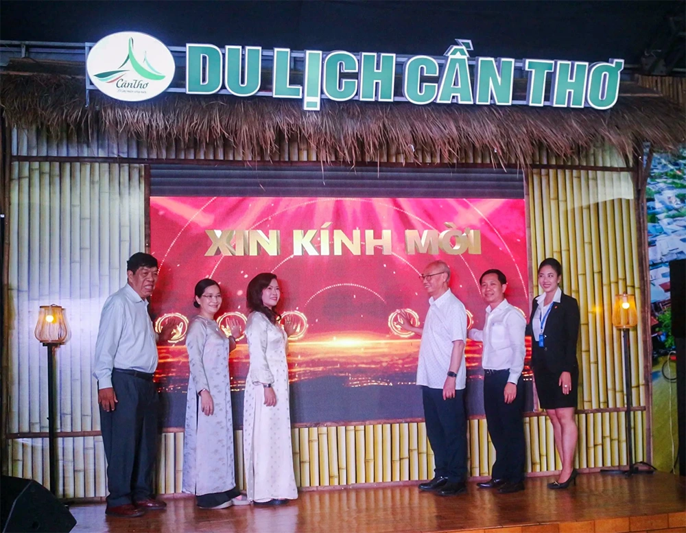 Bà Nguyễn Thị Ngọc Điệp, Phó Chủ tịch UBND thành phố; lãnh đạo Trung tâm Xúc tiến Đầu tư - Thương mại và Du lịch; Sở Văn hóa, Thể thao và Du lịch, Hiệp hội Du lịch Việt Nam; Hiệp hội Du lịch TP Cần Thơ, thực hiện nghi thức khai mạc Không gian quảng bá du lịch. Ảnh: KIỀU MAI