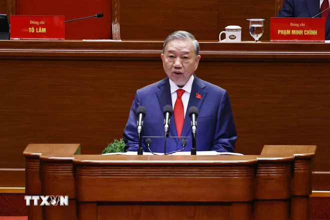 Tổng Bí thư Tô Lâm trình bày Báo cáo của Ban Chấp hành Trung ương Đảng khóa XIII về các văn kiện trình Đại hội XIV của Đảng. (Ảnh: TTXVN)